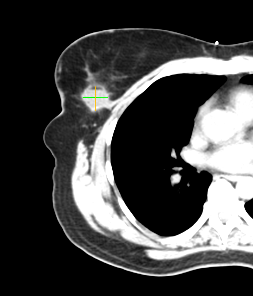 We left Frank’s office and developed a treatment plan with Kimberly’s surgeon and medical oncologist a few days later. The plan included surgery (lumpectomy) followed by radiation therapy. Surgery was successful, as you can see in the before and after images below. (Special thanks to the Horos Project for the open source DICOM viewer.)