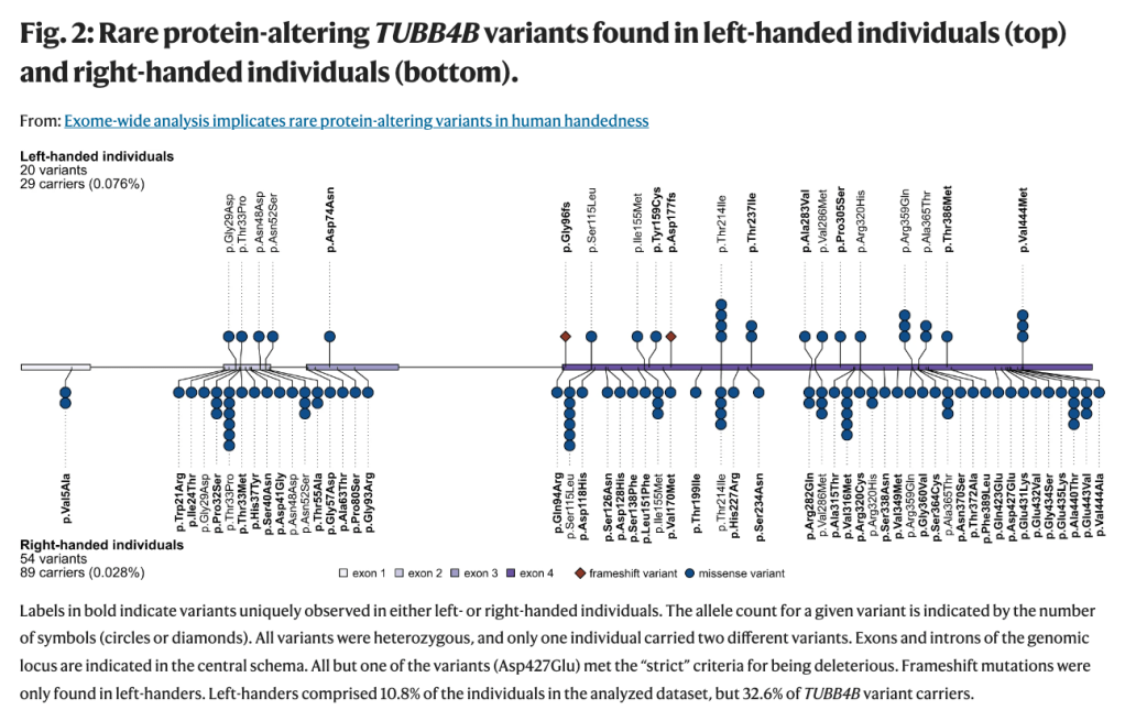 Are you a lefty? Well, I am. And so was my mom. And her father. AND our daughter. So I was curious to learn how rare genetic factors may contribute to the roughly 10% of us who are left-handed. As reported in GenomeWeb, researchers at the Max Planck Institute for Psycholinguistics in the Netherlands and Radboud University used exome data from the UK Biobank to search for clues. What they found is that variations in the beta-tubulin gene TUBB4B occurred at a rate 2.7 times higher in left-handers than right-handers.