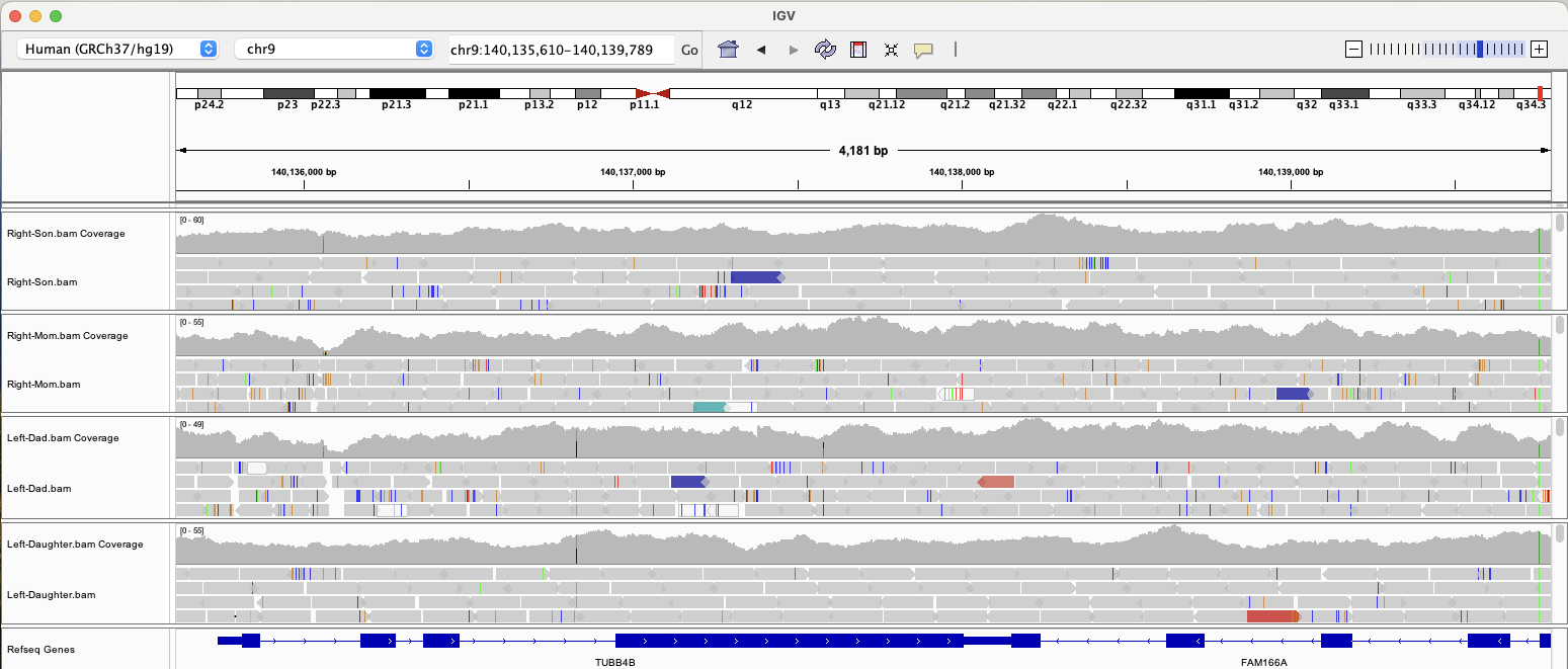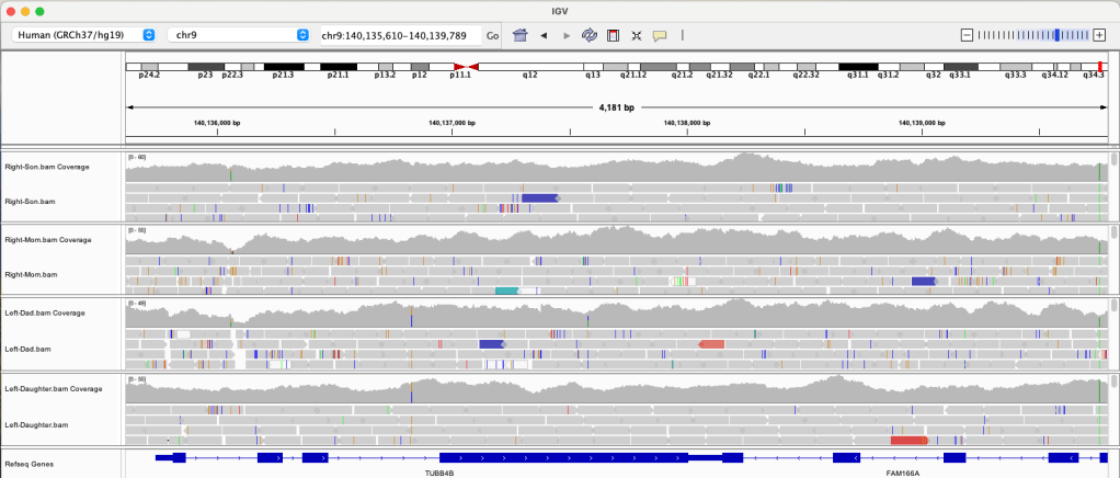 Naturally, I wanted to see if our daughter and I shared any of these mutations, so I fired up IGV to visualize our WGS data and take a look at TUBB4B. (Click the image to make it larger.)